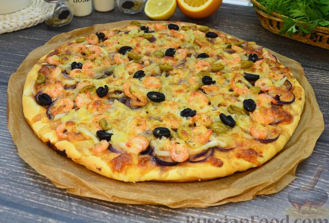 Креветки, мидии, кальмары, сыр моцарелла, соус томатный, майонез, маслины, помидоры, специи.