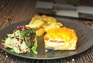 Филе судака, соус сливочный, томаты, картофель, сыр российский, подаётся с картофелем по-деревенски или фри и миксом салатов