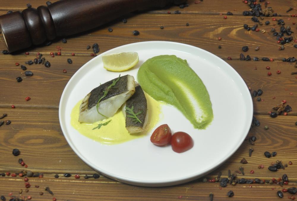Филе угольной рыбы, брокколи, соус сливочно-цитрусовый, лимон, помидоры черри, специи