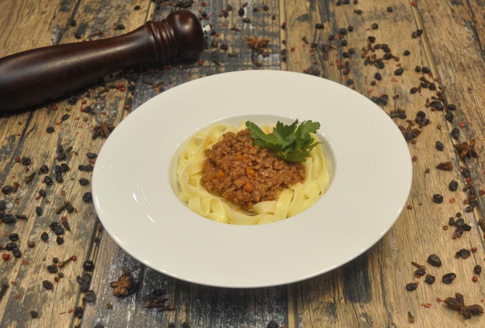Макароны Фетучини, мясо Говядина, морковь, помидоры в соб. соку, лук репчатый, масло подсолнечное, специи.