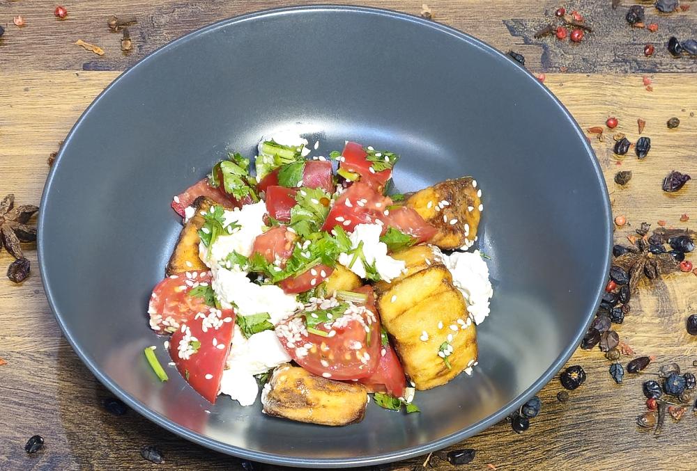 Баклажаны, помидор, сыр творожный, соус чили кисло-сладкий, кунжут, зелень.